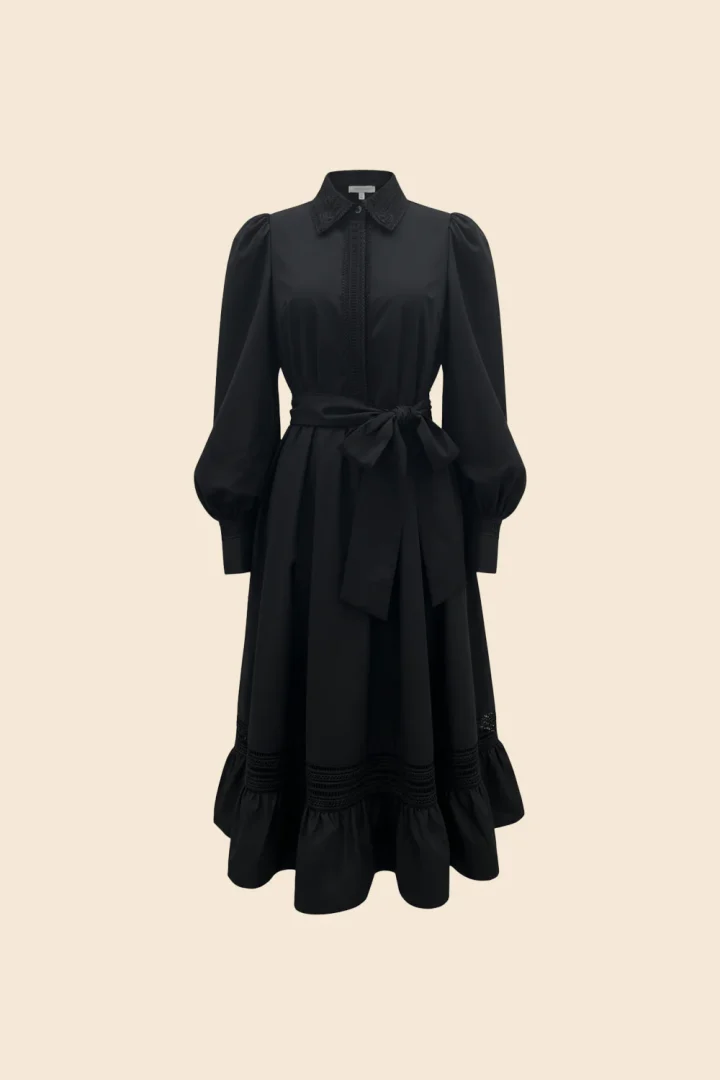 Amandine Dress er en elegant og uttrykksfull skjortekjole med vakre detaljer og en tidløs, feminin silhuett. Den har klassisk krage, knapper foran og lange ermer med mansjetter. Kjolen er innsvinget i midjen med et avtagbart knytebelte og har et voluminøst skjørt med rysjer og dekorative blonde- og bånddetaljer i kontrastfarge.