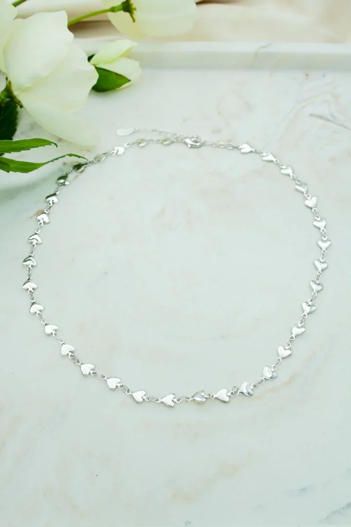 Et feminint og lekent smykke som kombinerer glans med kjærlighet. Dette delikate kjedet består av små hjerteformede lenker i sølvbelagt messing, og passer perfekt både alene og i kombinasjon med andre smykker.