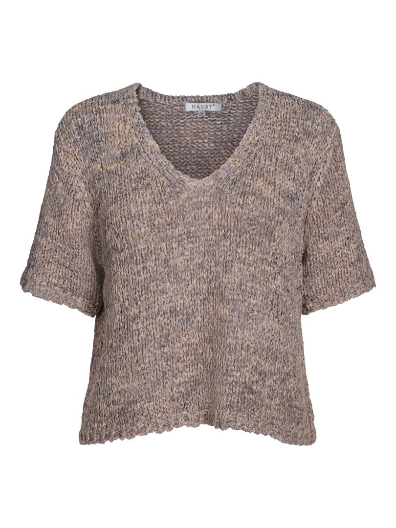 En kortermet pullover i en myk blanding av 50 % bomull og 50 % nylon, perfekt for de kjølige sommerdagene. Den klassiske V-halsen og strikkede teksturen gir et tidløst og elegant uttrykk, mens den korte passformen tilfører et lett og avslappet preg.