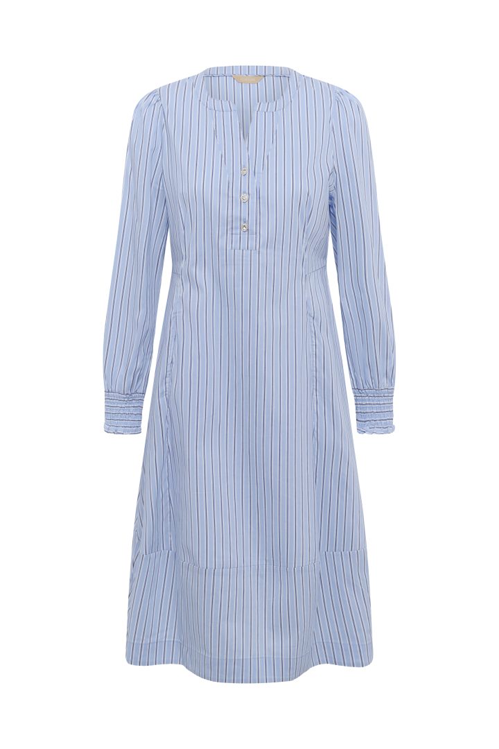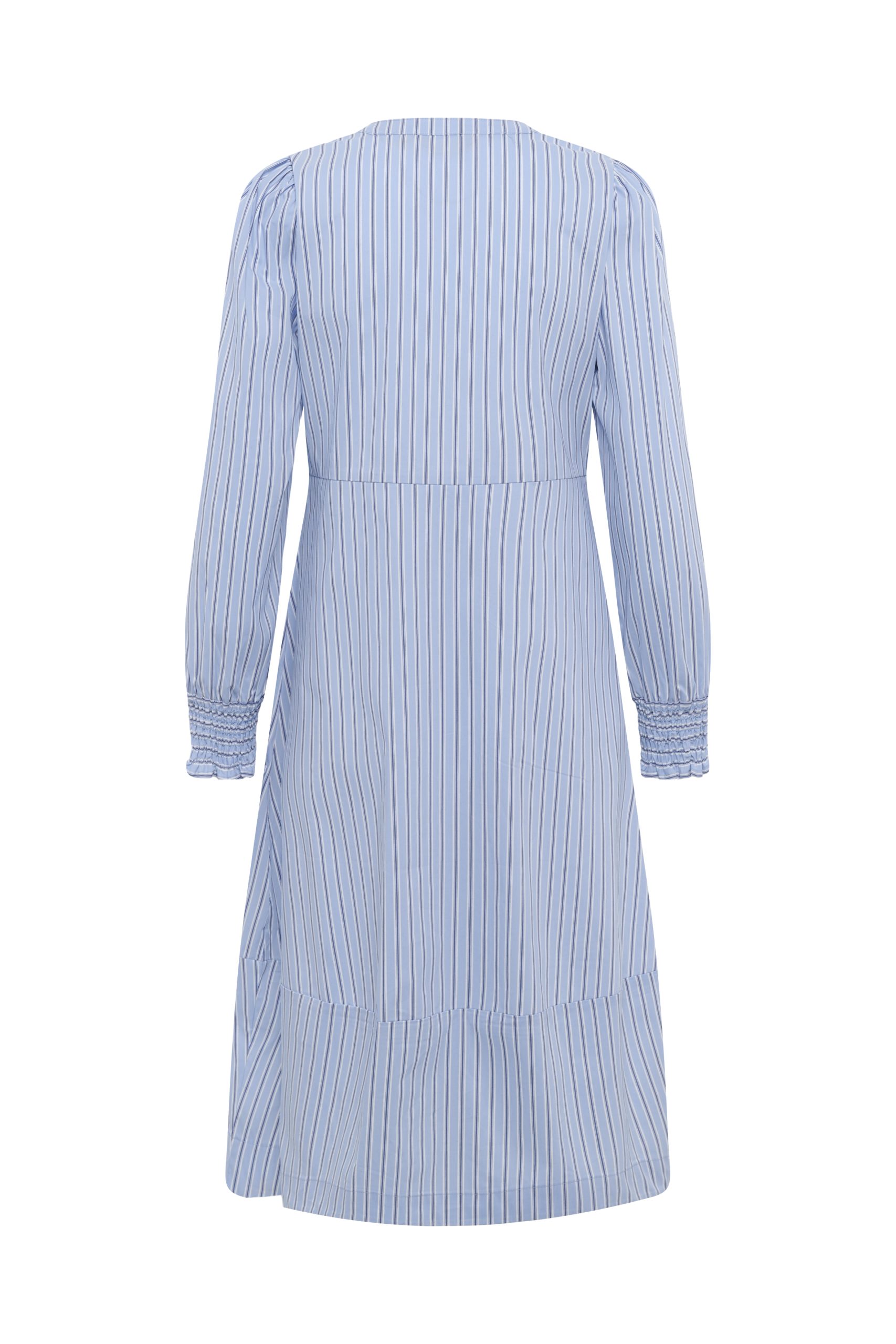 Denne kjolen for dame har avslappet passform, moderne V-hals med knapper, lange ermer med smock og midi-lengde. Komfortabel for hverdagsbruk og allsidige anledninger.