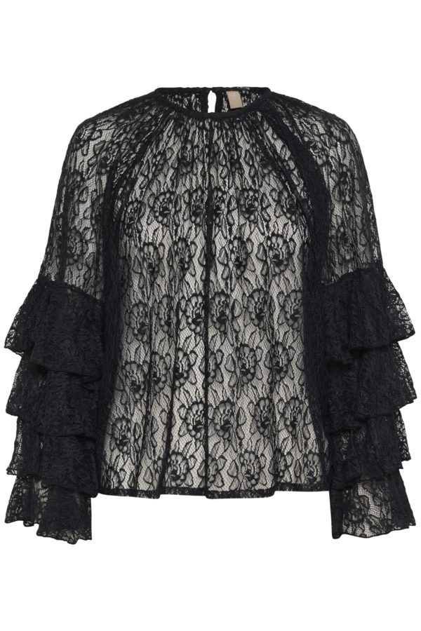 Blondebluse med avslappet passform, rund hals og lagdelte volangermer. Gir et elegant uttrykk og komfort i enhver anledning.