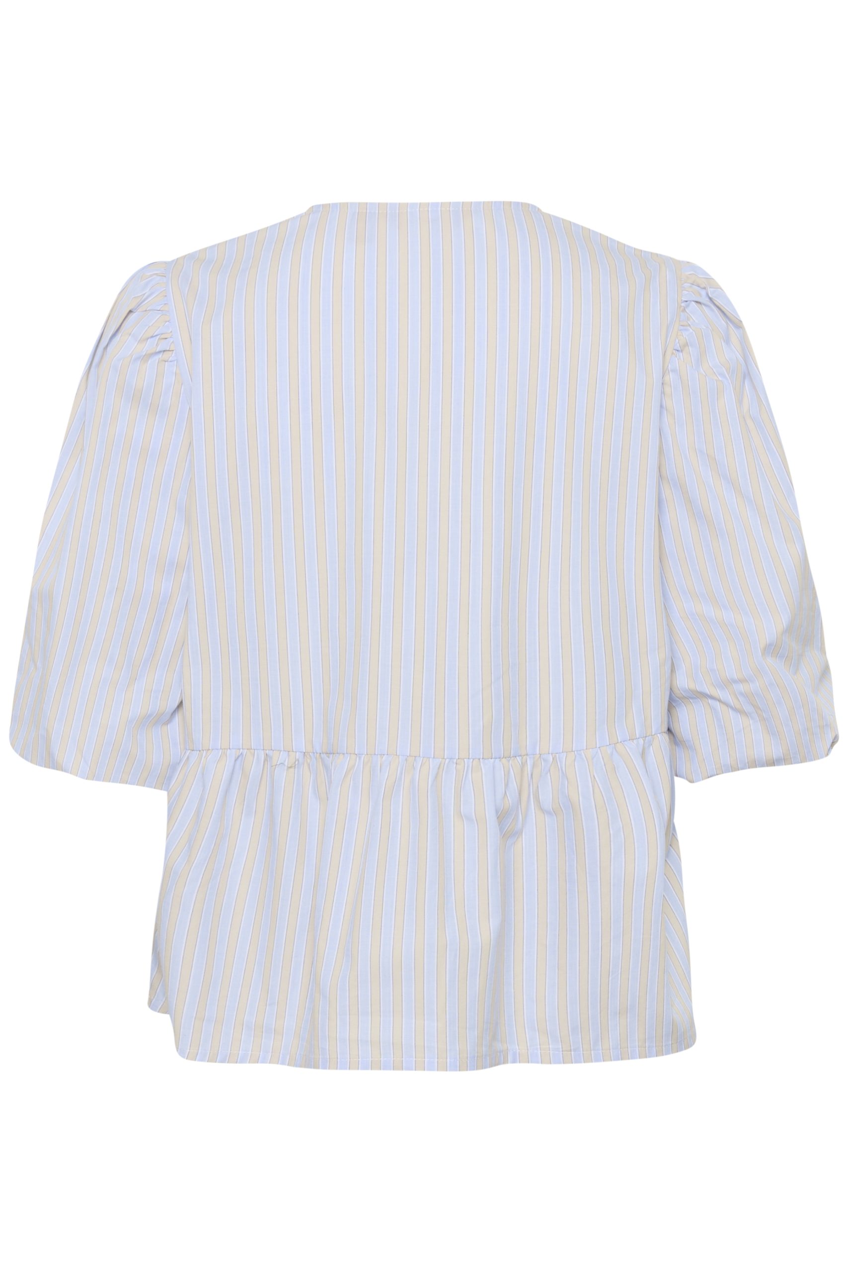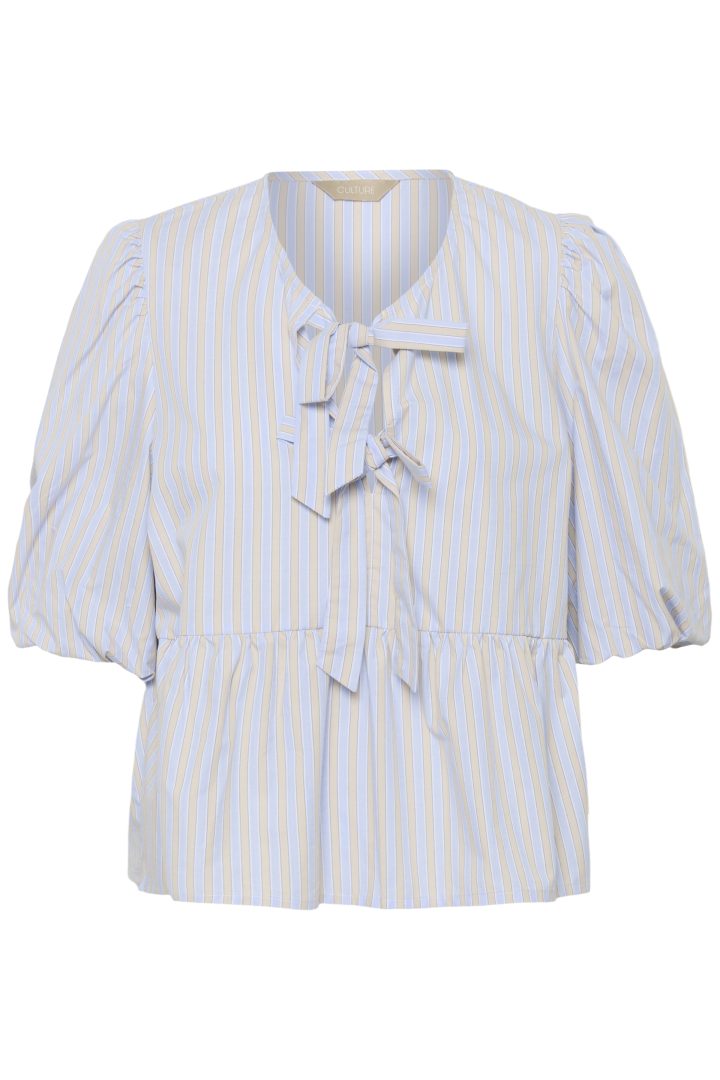Bluse til dame med avslappet passform, dekorative knytedetaljer, V-utringning og luftige halvlange ermer. Peplumkant gir flatterende silhuett.