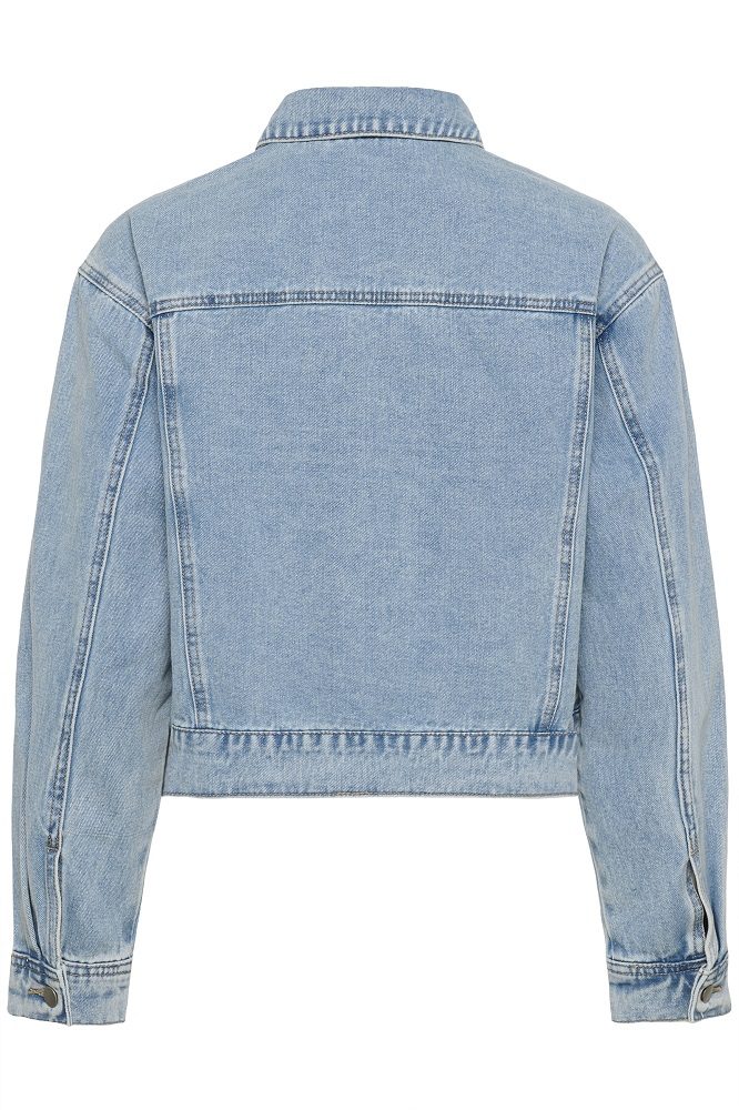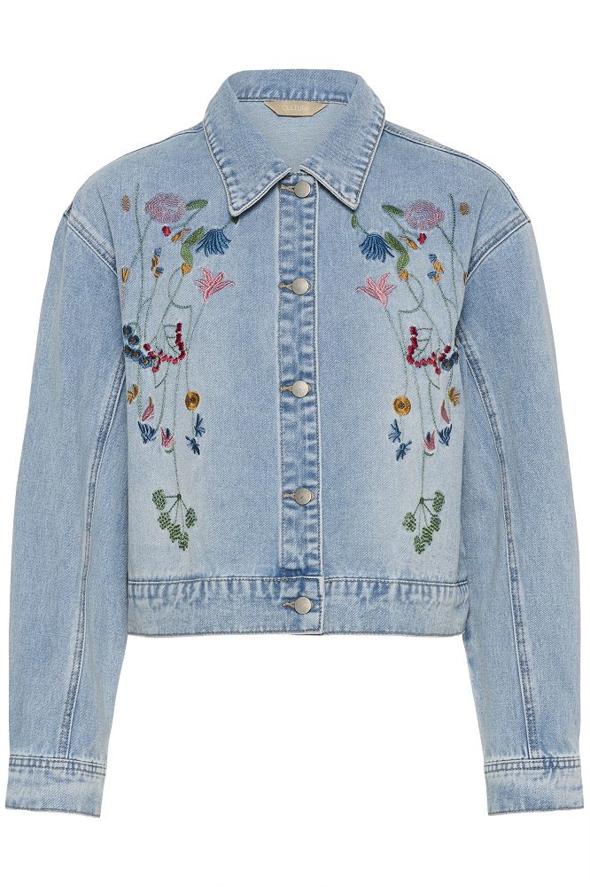 Denimjakke med rett passform, spiss krage, lange ermer og metallknapper. Blomstrete broderi foran