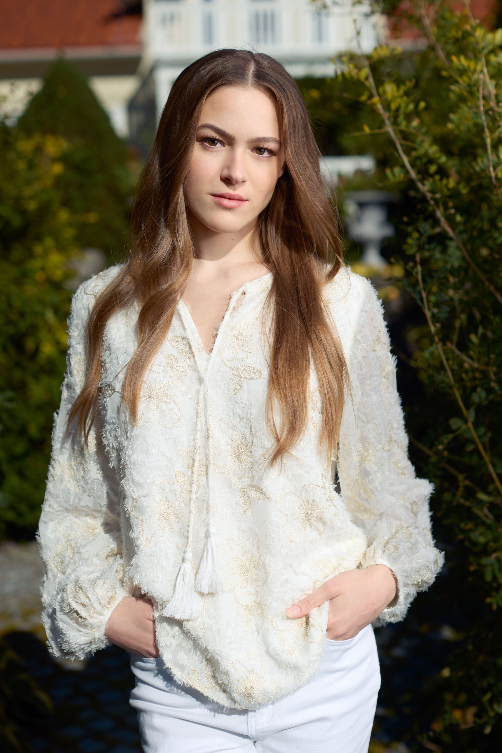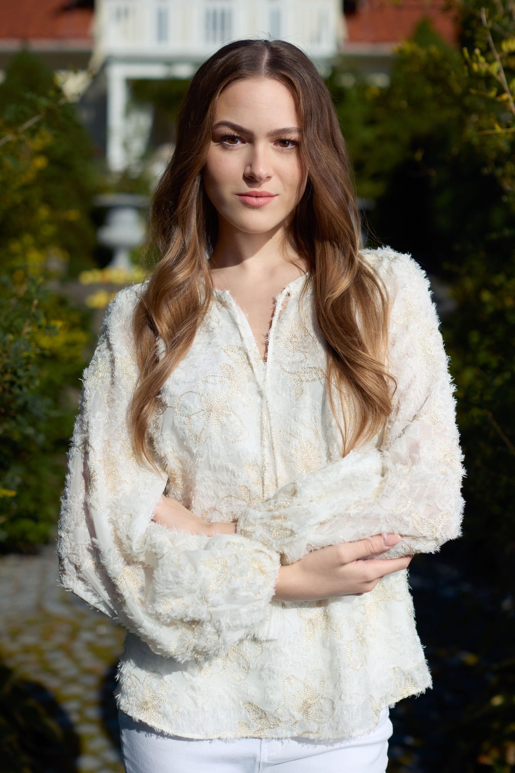 En feminin og elegant bluse fra Haust Collection. Blusen har en avslappet passform med lange ermer og knyting i halsen, som tilfører et mykt og romantisk preg. Det fine mønsteret gir tekstur og dybde, og gjør blusen til et iøynefallende innslag i garderoben.