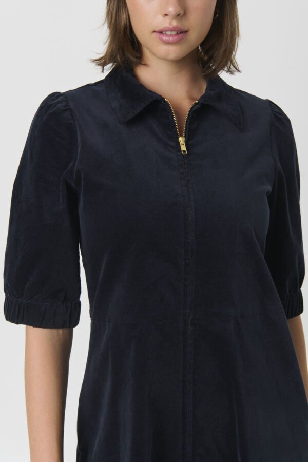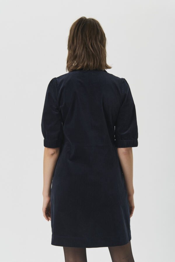 Den har spiss krage og stikklommer i begge sidene. Glidelåslukkingen gir den en moderne touch. Den har 3/4 lange, ledige ermer med legg på skuldrene og strikk nederst. Snittlinje i midjen som skaper en flatterende fasong.