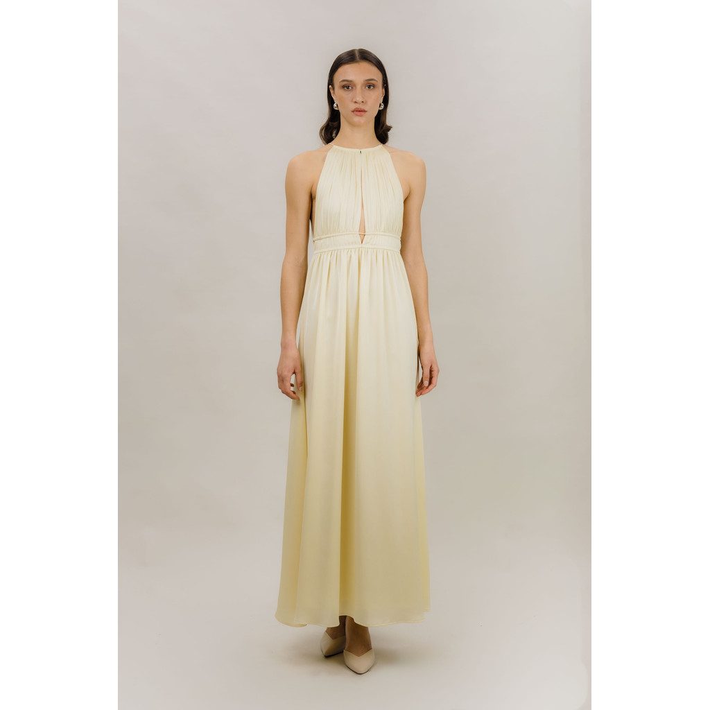 Lillibeth er en elegant maksi-silhuett designet for å bevege seg med letthet og eleganse. Med en høy halterneck-utringning og samlet midje skaper den en mykt skulpturert form som flyter inn i et langt, flytende skjørt. Et raffinert anledningsplagg med et rent, moderne uttrykk – ideelt for varme værforhold og elegant styling. Farge: Pastellgul / Mandelblomst / Mørk oliven. Høy halterneck-utringning. Samlet midje for definisjon. Maksilengde med flagrende skjørt. Elegant anledningsklart design.