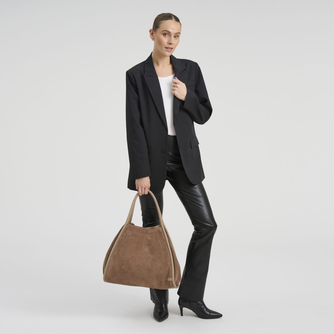 Elegant taupe semsket shopper som kombinerer tidløs stil med praktisk romslighet.