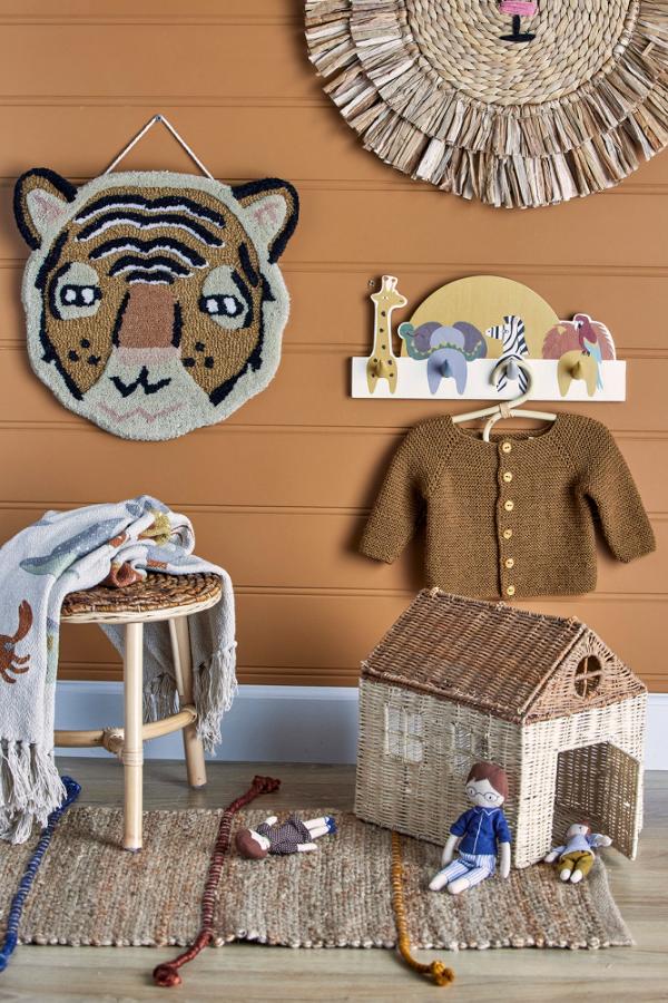 Mallen-kledningsstativet fra Bloomingville MINI er dekorert med flere forskjellige dyr, med totalt fire kroker på dyrenes haler. Bruk kledningsstativet på barnerommet til å henge opp barnets klær, jakker eller andre små tilbehør. Det kommer i en fin gaveeske.