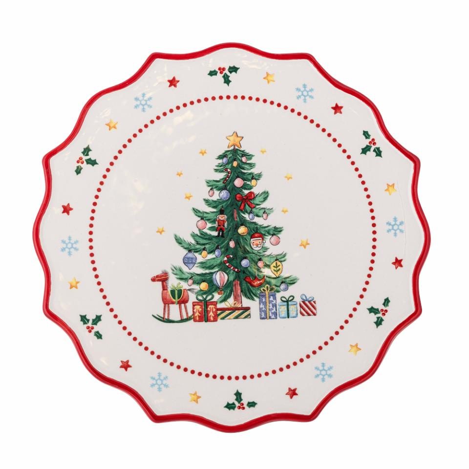 Kakefatet Naive fra Bloomingville er vakkert dekorert med et detaljert juletremotiv, omgitt av fargerike julefigurer. Den håndmalte røde kanten fremhever elegant fatets bølgete form og skaper en innbydende ramme for servering av julegodt. Den unike håndmalte finishen sikrer at hvert fat er unikt, noe som gjør det til et unikt tillegg til julepynten og borddekningen.