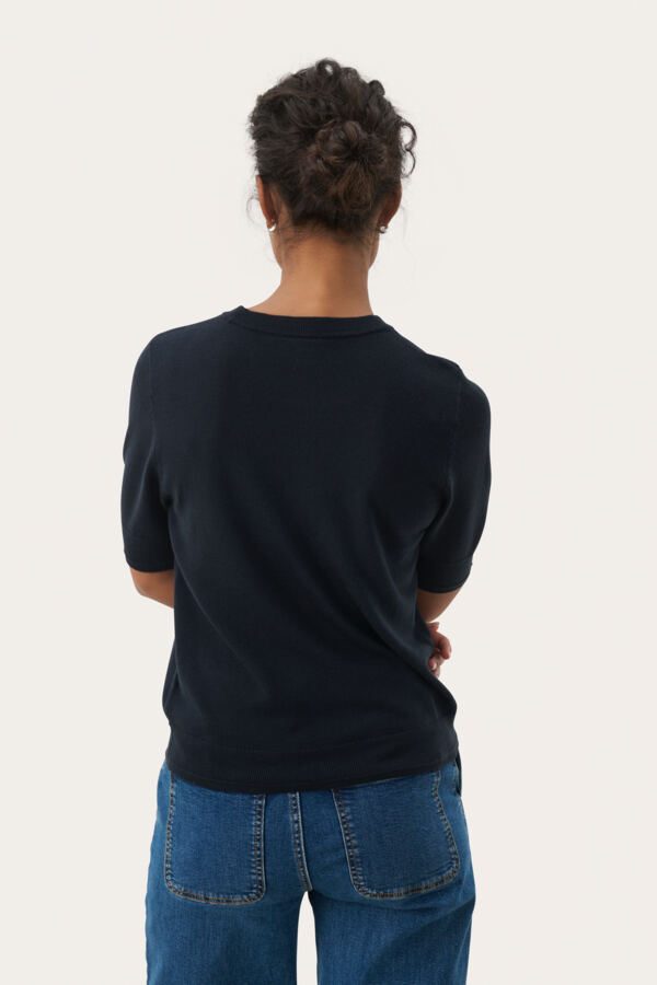 Denne kortermede strikken i 100 % ull har rund hals og et klassisk, tidløst snitt. Den myke ullen føles behagelig mot huden og gir et lett og luksuriøst uttrykk. Bruk den alene eller under en blazer eller cardigan.