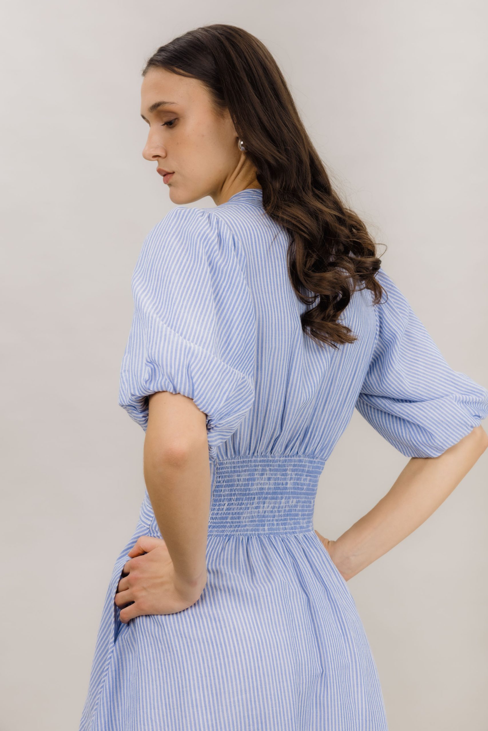 Papira er en strukturert, men feminin stripete kjole designet med særegen volum og moderne sjarm. Med puffermer, en definert midje og lagdelte skjørtdetaljer, skaper denne stilen en flatterende, moteriktig silhuett. Laget av 100 % bomull, balanserer Papira komfort med et statement-design. Farge: Blå striper. Stripete bomullsstoff. Puffermerdetalj. Definert midje. Lagdelt skjørtdesign. Moderne og feminin.