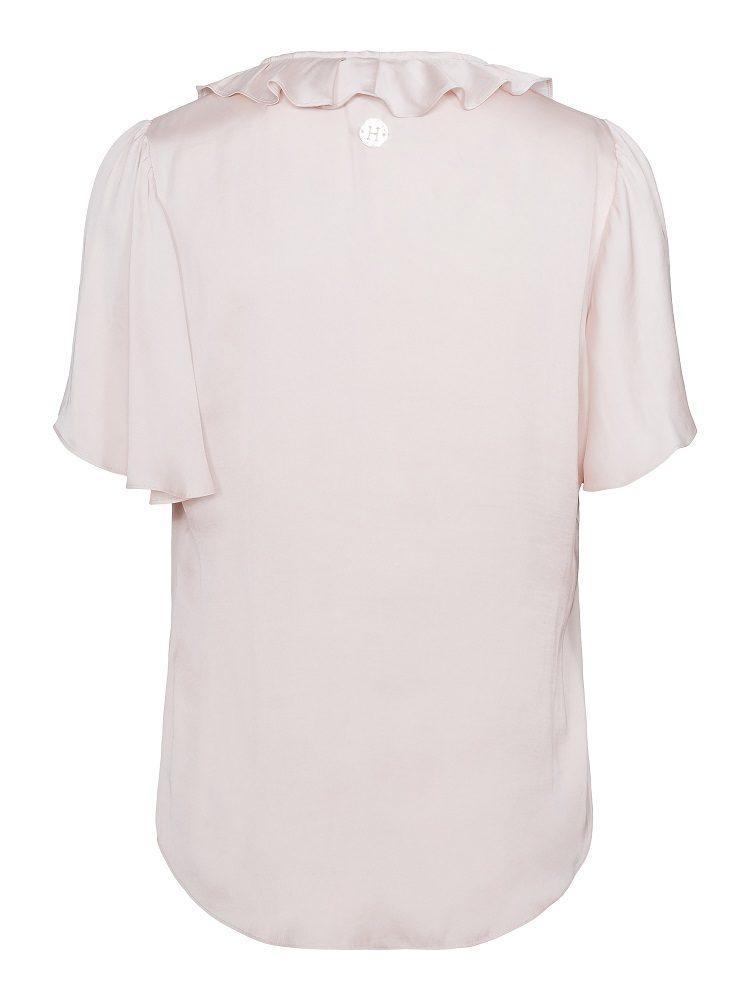 En feminin og elegant bluse fra med et mykt og romantisk uttrykk. Blusen har en flatterende V-utringning med volangdetaljer og knyting i front, dekorert med dusker som tilfører et lekent og sofistikert preg. De korte ermene og den avslappede passformen gir en lett og luftig silhuett som faller pent.