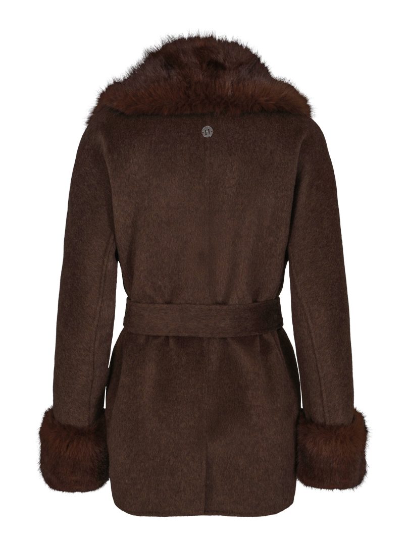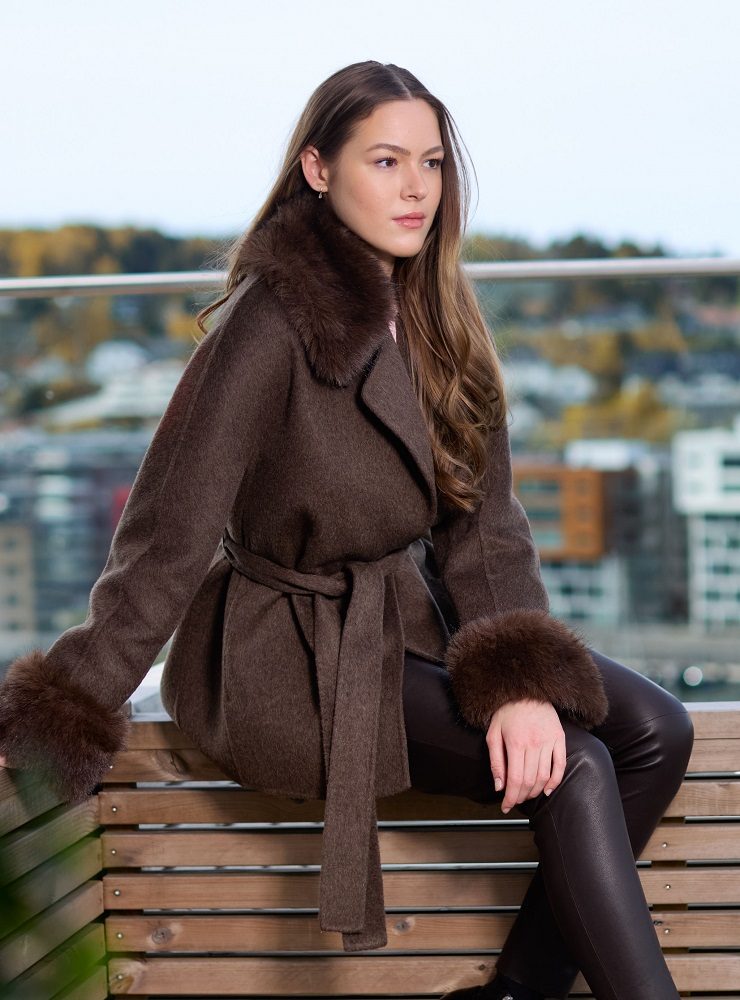 Denne elegante ulljakken er det perfekte valget for deg som ønsker stil og komfort i ett. Med sin delikate farge, myke ullblanding (90 % ull og 10 % nylon), og feminine detaljer, er denne jakken like vakker som den er praktisk. Den har en flatterende kort lengde, belte i livet og fuskepels på krage og mansjetter for en eksklusiv look.