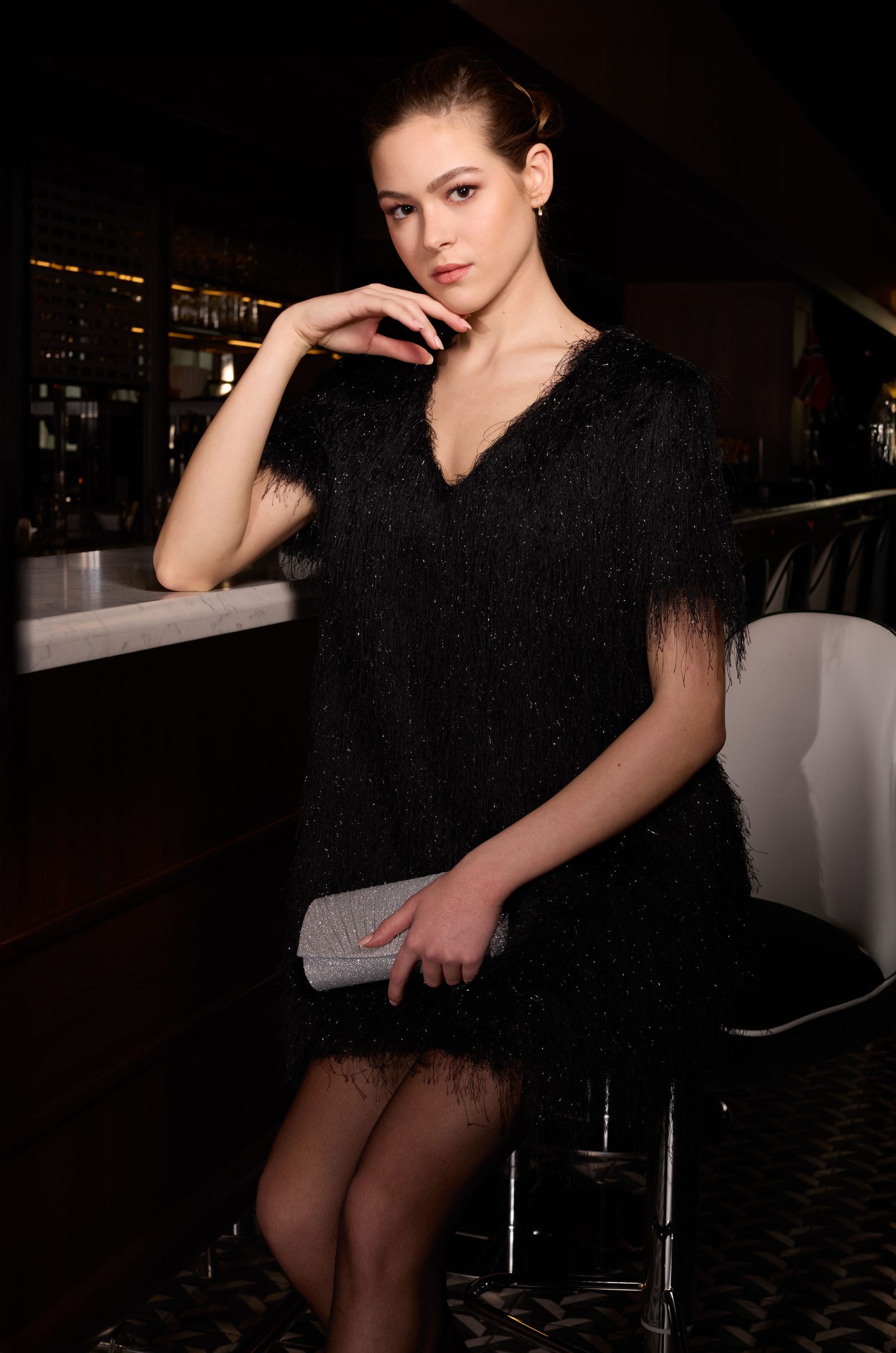 Hairy Dress er den ultimate kombinasjonen av stil og personlighet. Denne unike kjolen, laget av 33 % bomull, 10 % spandex og 57 % polyester, gir en komfortabel passform med en fantastisk tekstur og et hint av glitter som lyser opp kvelden. Den myke, «hairy» finishen gir et lekent, men sofistikert uttrykk, mens den dype V-halsen tilfører en feminin og elegant touch. Perfekt for festlige anledninger, kveld ute eller julebord.