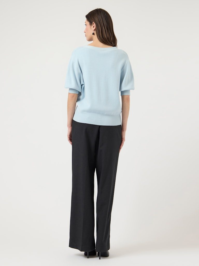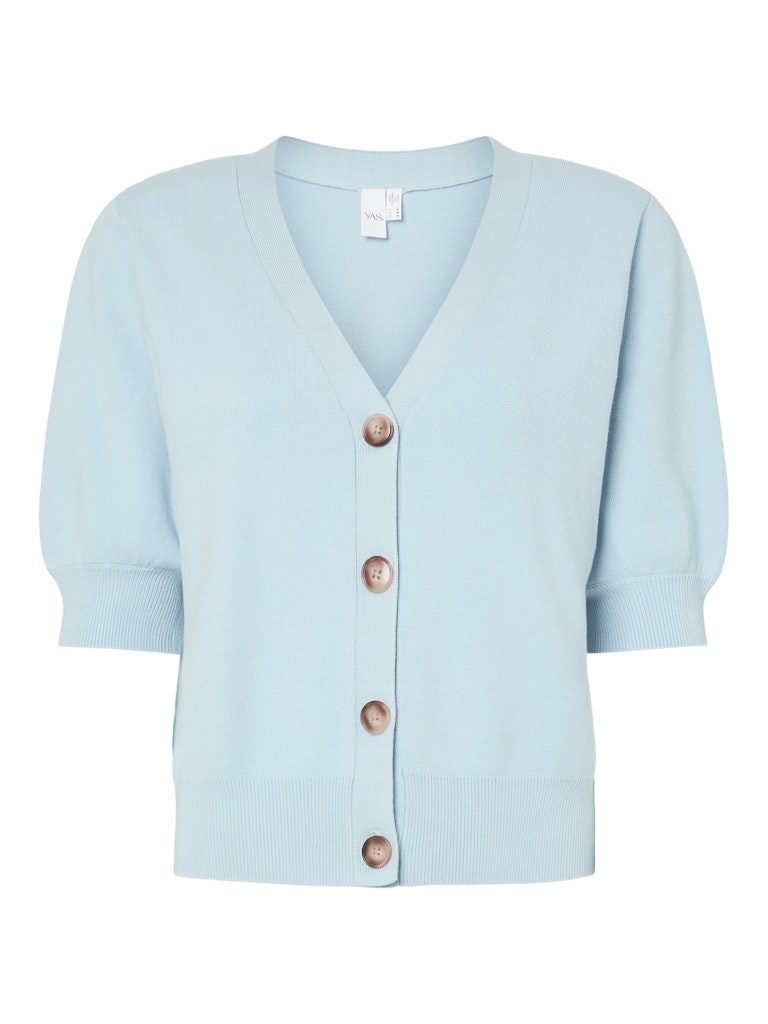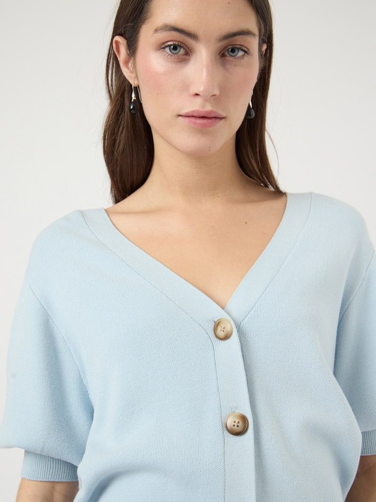 Kortermet cardigan laget av en myk viskoseblanding som gir en behagelig følelse mot huden. Den har en elegant V-hals, 2/4 ballongermer og ribbemansjetter, noe som gjør den til et stilig valg for enhver anledning.